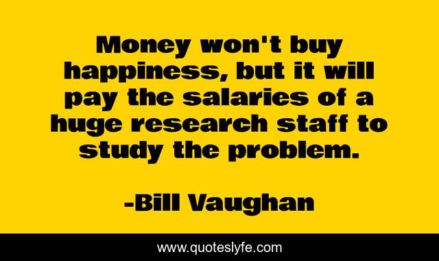 This page presents the quote "Money won't buy happiness, but it will pay the salaries of a huge research staff to study the problem.". Author of this quote is Bill Vaughan. This quote is about money, happiness,.