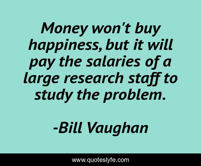 This page presents the quote "Money won't buy happiness, but it will pay the salaries of a large research staff to study the problem.". Author of this quote is Bill Vaughan. This quote is about funny, comedy, money, research,.