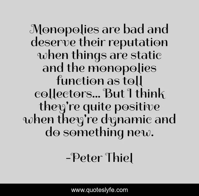 This page presents the quote "Monopolies are bad and deserve their reputation when things are static and the monopolies function as toll collectors... But I think they're quite positive when they're dynamic and do something new.". Author of this quote is Peter Thiel. This quote is about deserve, reputation, think,.