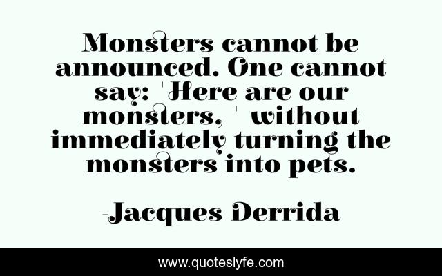 This page presents the quote "Monsters cannot be announced. One cannot say: 'Here are our monsters, ' without immediately turning the monsters into pets.". Author of this quote is Jacques Derrida. This quote is about confusion, order, pets, wild, tame, monsters,.