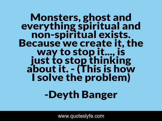 This page presents the quote "Monsters, ghost and everything spiritual and non-spiritual exists. Because we create it, the way to stop it..., is just to stop thinking about it. - (This is how I solve the problem)". Author of this quote is Deyth Banger. This quote is about horror, solve, it, ghosts, monsters,.