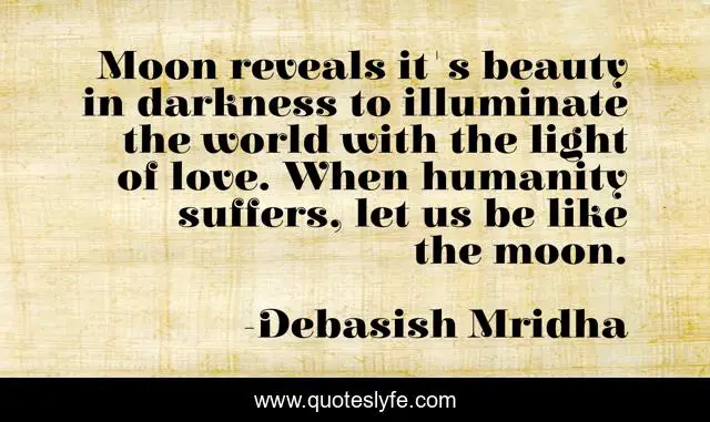 This page presents the quote "Moon reveals it's beauty in darkness to illuminate the world with the light of love. When humanity suffers, let us be like the moon.". Author of this quote is Debasish Mridha. This quote is about life, love, knowledge, inspirational, intelligence, philosophy, wisdom, quotes, affection,.