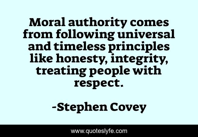 This page presents the quote "Moral authority comes from following universal and timeless principles like honesty, integrity, treating people with respect.". Author of this quote is Stephen Covey. This quote is about integrity, honesty, people,.