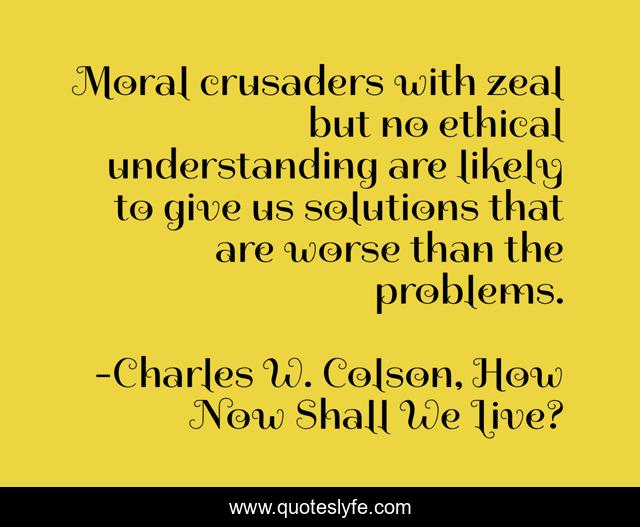 This page presents the quote "Moral crusaders with zeal but no ethical understanding are likely to give us solutions that are worse than the problems.". Author of this quote is Charles W. Colson, How Now Shall We Live?. .