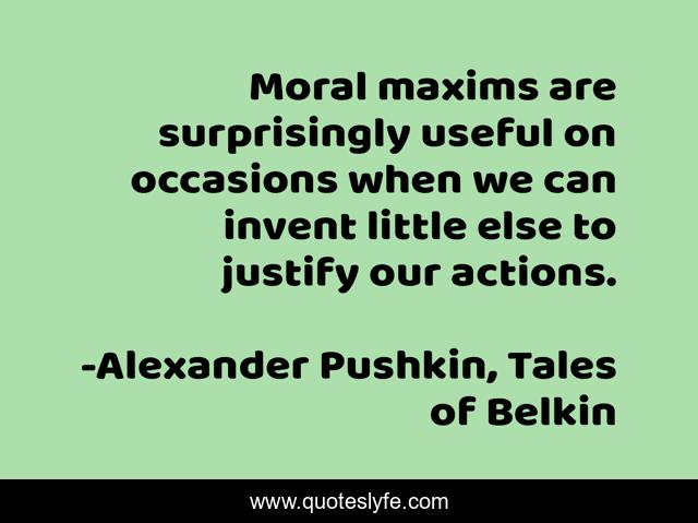 This page presents the quote "Moral maxims are surprisingly useful on occasions when we can invent little else to justify our actions.". Author of this quote is Alexander Pushkin, Tales of Belkin. This quote is about russian, morality,.