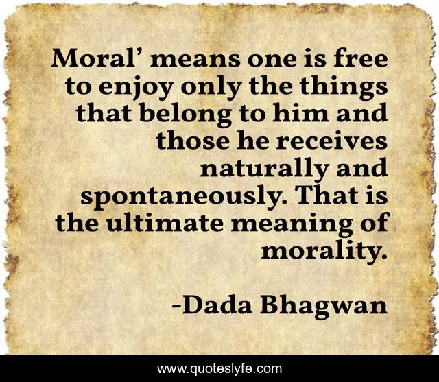 This page presents the quote "Moral’ means one is free to enjoy only the things that belong to him and those he receives naturally and spontaneously. That is the ultimate meaning of morality.". Author of this quote is Dada Bhagwan. This quote is about enjoy, spiritual, free, spontaneously, moral, ultimate, naturally,.