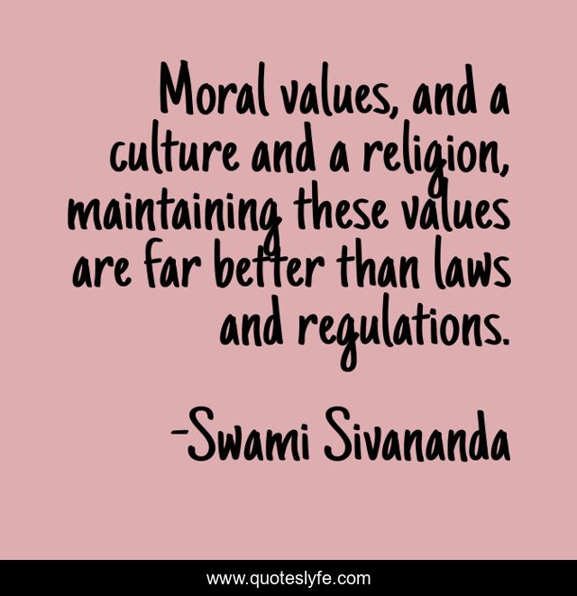 This page presents the quote "Moral values, and a culture and a religion, maintaining these values are far better than laws and regulations.". Author of this quote is Swami Sivananda. This quote is about culture, values, moral,.