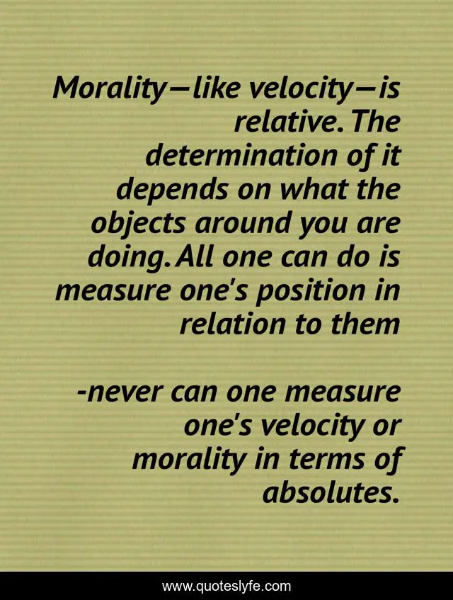 "never can one measure one's velocity or morality in terms of absolutes. Quotes." Quoteslyfe.com, 2025. Sat. 13 Dec. 2025. <https://www.quoteslyfe.com/quote/Morality-like-velocity-is-relative-The-determination-205428>.