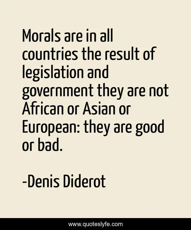 This page presents the quote "Morals are in all countries the result of legislation and government they are not African or Asian or European: they are good or bad.". Author of this quote is Denis Diderot. This quote is about bad, good, morals,.