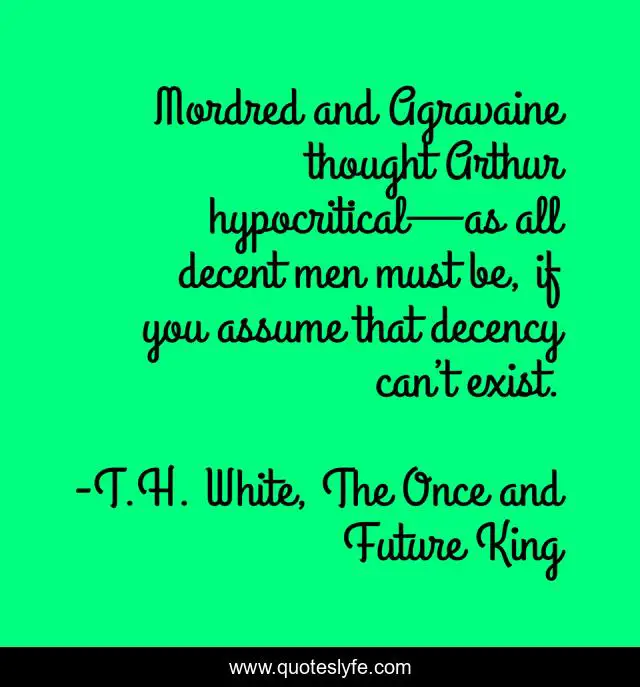 This page presents the quote "Mordred and Agravaine thought Arthur hypocritical—as all decent men must be, if you assume that decency can’t exist.". Author of this quote is T.H. White, The Once and Future King. This quote is about decency, hypocrisy,.