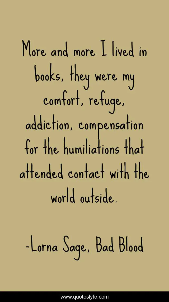 This page presents the quote "More and more I lived in books, they were my comfort, refuge, addiction, compensation for the humiliations that attended contact with the world outside.". Author of this quote is Lorna Sage, Bad Blood. .