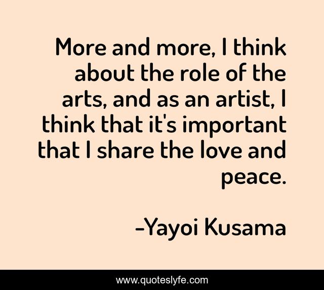 This page presents the quote "More and more, I think about the role of the arts, and as an artist, I think that it's important that I share the love and peace.". Author of this quote is Yayoi Kusama. This quote is about love, think, affection, artist,.