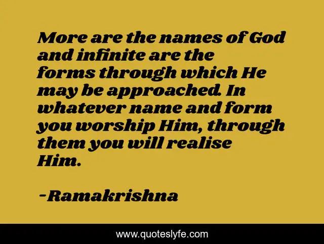 This page presents the quote "More are the names of God and infinite are the forms through which He may be approached. In whatever name and form you worship Him, through them you will realise Him.". Author of this quote is Ramakrishna. This quote is about through, name,.