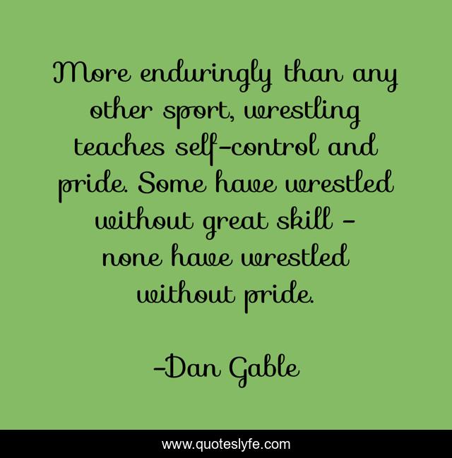 This page presents the quote "More enduringly than any other sport, wrestling teaches self-control and pride. Some have wrestled without great skill - none have wrestled without pride.". Author of this quote is Dan Gable. This quote is about skill, pride, wrestling,.