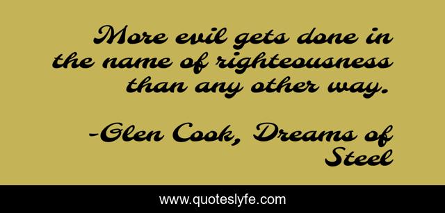This page presents the quote "More evil gets done in the name of righteousness than any other way.". Author of this quote is Glen Cook, Dreams of Steel. This quote is about right-and-wrong, righteousness, evil,.