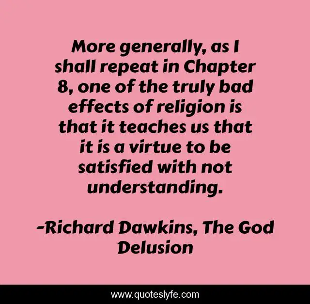 This page presents the quote "More generally, as I shall repeat in Chapter 8, one of the truly bad effects of religion is that it teaches us that it is a virtue to be satisfied with not understanding.". Author of this quote is Richard Dawkins, The God Delusion. This quote is about satisfaction, willful-ignorance, ignorance, understanding,.