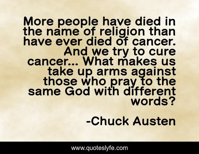 This page presents the quote "More people have died in the name of religion than have ever died of cancer. And we try to cure cancer... What makes us take up arms against those who pray to the same God with different words?". Author of this quote is Chuck Austen. .