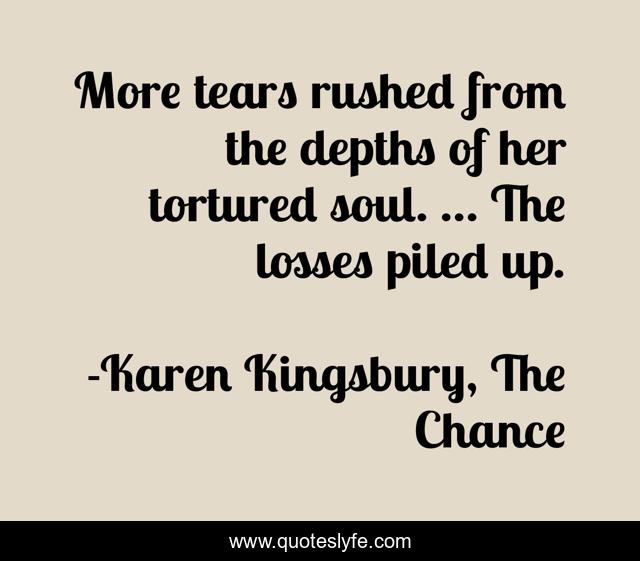 This page presents the quote "More tears rushed from the depths of her tortured soul. ... The losses piled up.". Author of this quote is Karen Kingsbury, The Chance. This quote is about loss, regret,.