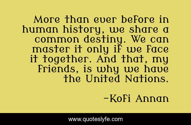 This page presents the quote "More than ever before in human history, we share a common destiny. We can master it only if we face it together. And that, my friends, is why we have the United Nations.". Author of this quote is Kofi Annan. This quote is about friends, destiny, together,.