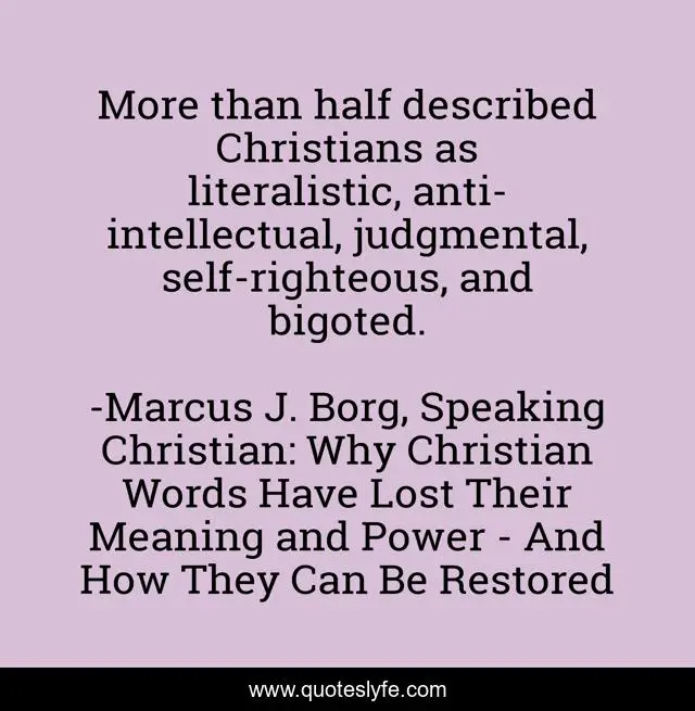 This page presents the quote "More than half described Christians as literalistic, anti-intellectual, judgmental, self-righteous, and bigoted.". Author of this quote is Marcus J. Borg, Speaking Christian: Why Christian Words Have Lost Their Meaning and Power - And How They Can Be Restored. .