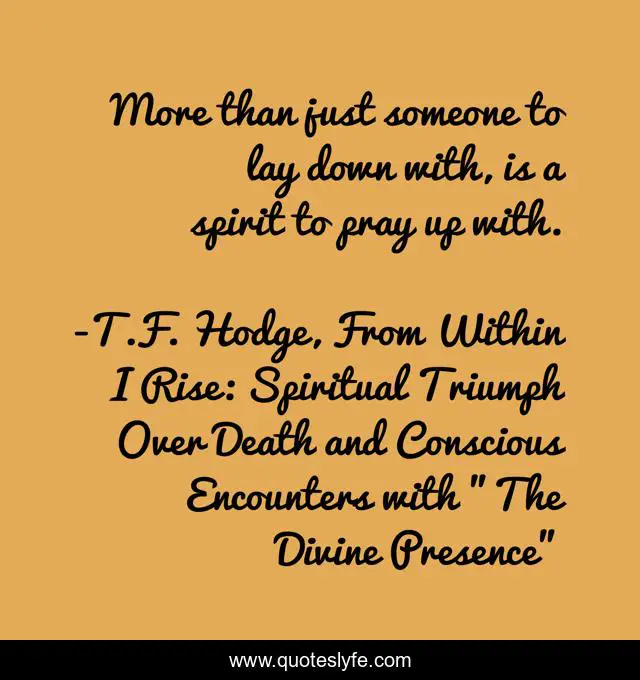 This page presents the quote "More than just someone to lay down with, is a spirit to pray up with.". Author of this quote is T.F. Hodge, From Within I Rise: Spiritual Triumph Over Death and Conscious Encounters with "The Divine Presence". This quote is about relationships, spiritual-growth, lovers, love, god, relationship-advice, marriage, marriage-life, god-s-love,.