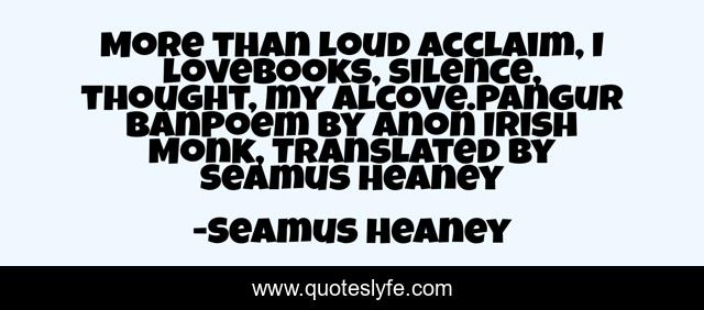 This page presents the quote "More than loud acclaim, I loveBooks, silence, thought, my alcove.Pangur BánPoem by Anon Irish Monk, Translated by Seamus Heaney". Author of this quote is Seamus Heaney. This quote is about poem, irish, books,.