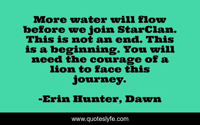 This page presents the quote "More water will flow before we join StarClan. This is not an end. This is a beginning. You will need the courage of a lion to face this journey.". Author of this quote is Erin Hunter, Dawn. This quote is about warriors, cats, ravenpaw,.
