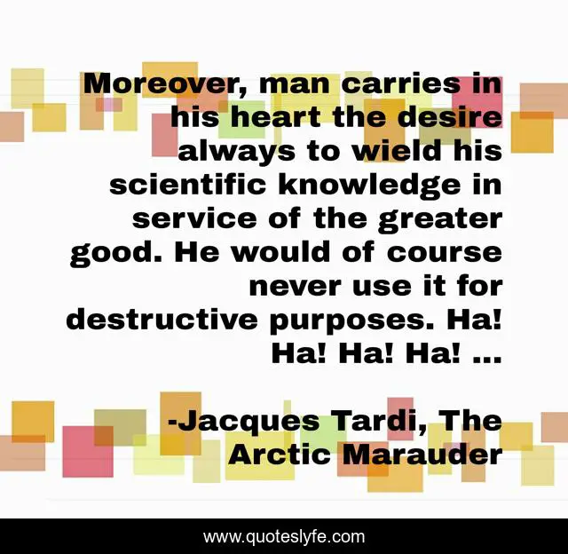 This page presents the quote "Moreover, man carries in his heart the desire always to wield his scientific knowledge in service of the greater good. He would of course never use it for destructive purposes. Ha! Ha! Ha! Ha! ...". Author of this quote is Jacques Tardi, The Arctic Marauder. This quote is about dark-humour, dark-humor, humanity, evil,.