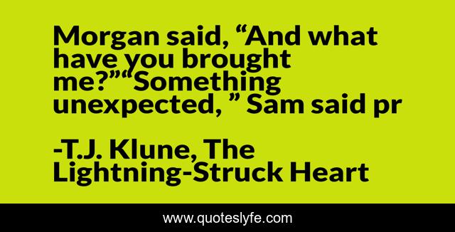 This page presents the quote "Morgan said, “And what have you brought me?”“Something unexpected, ” Sam said pr". Author of this quote is T.J. Klune, The Lightning-Struck Heart. .