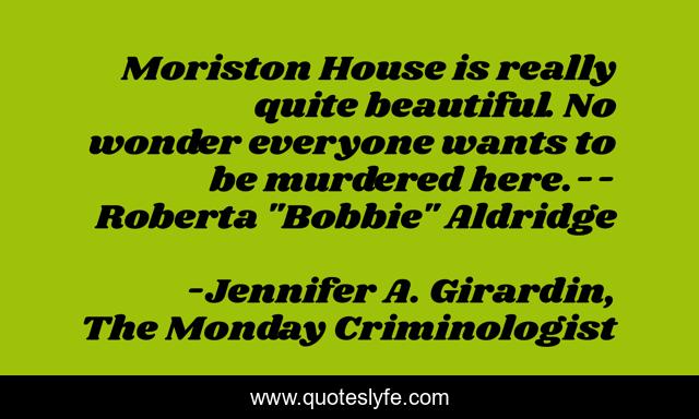 This page presents the quote "Moriston House is really quite beautiful. No wonder everyone wants to be murdered here.--Roberta "Bobbie" Aldridge". Author of this quote is Jennifer A. Girardin, The Monday Criminologist. This quote is about british-detective-fiction, amateur-sleuth, crime,.