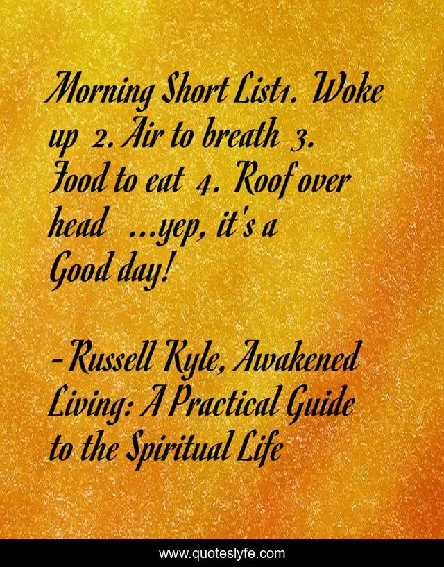 This page presents the quote "Morning Short List1. Woke up ✓2. Air to breath ✓3. Food to eat ✓4. Roof over head ✓ ...yep, it's a Good day!". Author of this quote is Russell Kyle, Awakened Living: A Practical Guide to the Spiritual Life. This quote is about gratitude, enthusiasm, spiritual, inspirational, morning,.
