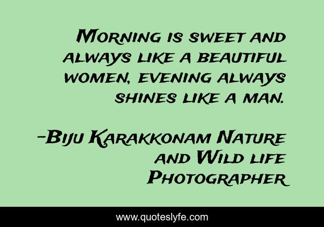 This page presents the quote "Morning is sweet and always like a beautiful women, evening always shines like a man.". Author of this quote is Biju Karakkonam Nature and Wild life Photographer. This quote is about beautiful, nature, biju-karakkonam, men, good-morning, good-evening, women,.