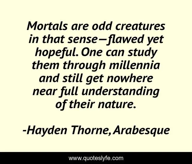 This page presents the quote "Mortals are odd creatures in that sense—flawed yet hopeful. One can study them through millennia and still get nowhere near full understanding of their nature.". Author of this quote is Hayden Thorne, Arabesque. This quote is about philosophy, humanity,.