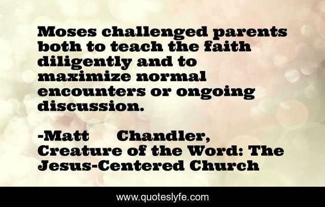 This page presents the quote "Moses challenged parents both to teach the faith diligently and to maximize normal encounters or ongoing discussion.". Author of this quote is Matt Chandler, Creature of the Word: The Jesus-Centered Church. This quote is about discipleship, evangelism,.