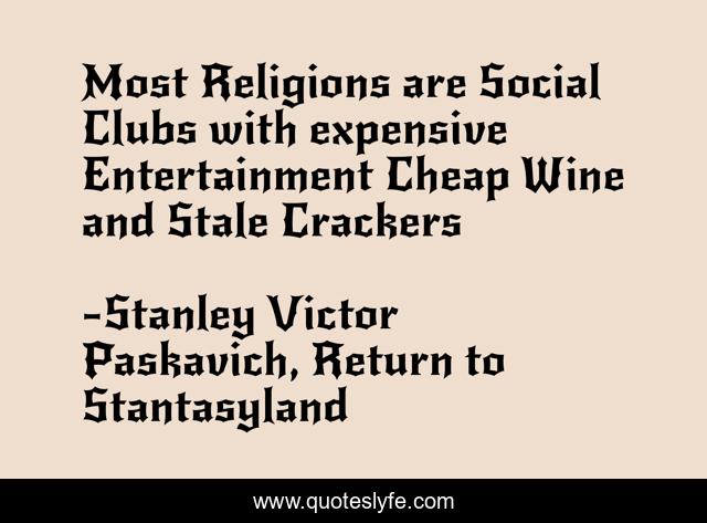 This page presents the quote "Most Religions are Social Clubs with expensive Entertainment Cheap Wine and Stale Crackers". Author of this quote is Stanley Victor Paskavich, Return to Stantasyland. This quote is about belief, religion, stantasyyland, spirituality, host, church,.