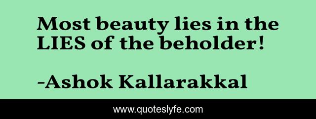 This page presents the quote "Most beauty lies in the LIES of the beholder!". Author of this quote is Ashok Kallarakkal. This quote is about beauty, curiosity-kills-the-katha, humorous, beholder, plato, palette-of-love, kallarakkal, lies, ashok,.