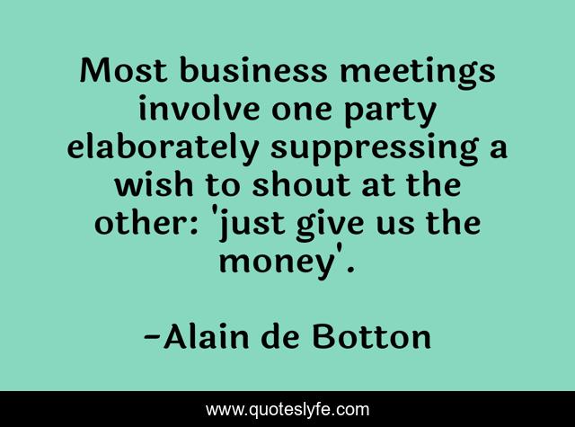 This page presents the quote "Most business meetings involve one party elaborately suppressing a wish to shout at the other: 'just give us the money'.". Author of this quote is Alain de Botton. This quote is about money, meetings, work, funding, business,.