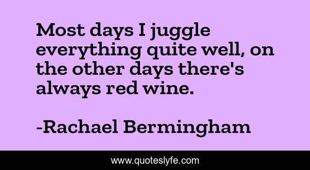 This page presents the quote "Most days I juggle everything quite well, on the other days there's always red wine.". Author of this quote is Rachael Bermingham. This quote is about confidence, positive, motivational, optimistic, inspirational, enthusiasm, life-and-living, wine,.