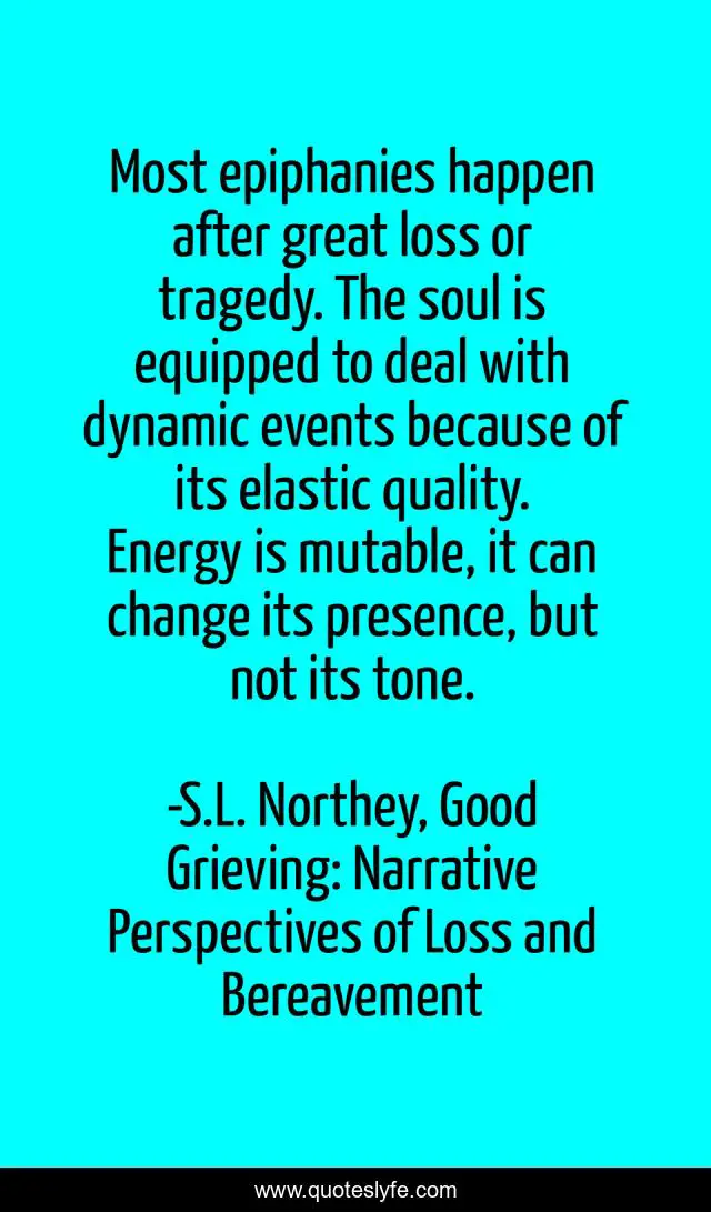 This page presents the quote "Most epiphanies happen after great loss or tragedy. The soul is equipped to deal with dynamic events because of its elastic quality. Energy is mutable, it can change its presence, but not its tone.". Author of this quote is S.L. Northey, Good Grieving: Narrative Perspectives of Loss and Bereavement. .