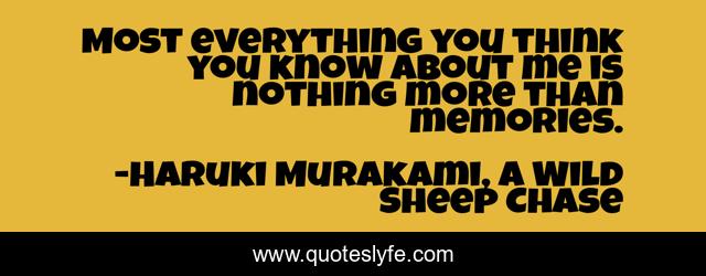 This page presents the quote "Most everything you think you know about me is nothing more than memories.". Author of this quote is Haruki Murakami, A Wild Sheep Chase. This quote is about relationships, life, memory,.