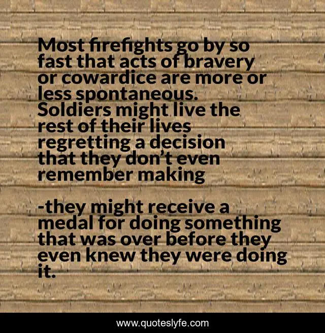 This page presents the quote "Most firefights go by so fast that acts of bravery or cowardice are more or less spontaneous. Soldiers might live the rest of their lives regretting a decision that they don’t even remember making". Author of this quote is they might receive a medal for doing something that was over before they even knew they were doing it.. This quote is about sebastian junger, war,.