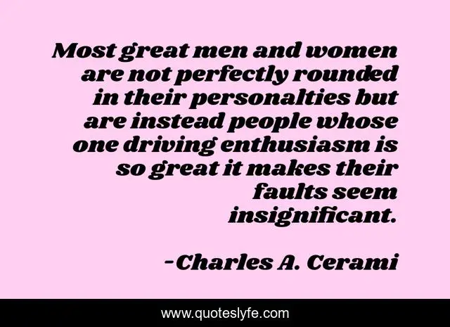 This page presents the quote "Most great men and women are not perfectly rounded in their personalties but are instead people whose one driving enthusiasm is so great it makes their faults seem insignificant.". Author of this quote is Charles A. Cerami. .