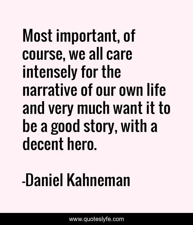 This page presents the quote "Most important, of course, we all care intensely for the narrative of our own life and very much want it to be a good story, with a decent hero.". Author of this quote is Daniel Kahneman. .