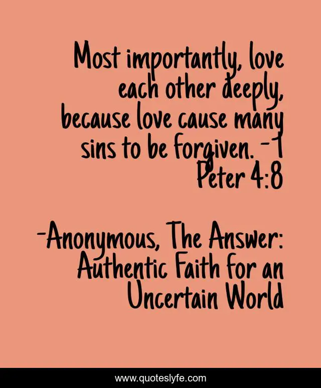 This page presents the quote "Most importantly, love each other deeply, because love cause many sins to be forgiven. - 1 Peter 4:8". Author of this quote is Anonymous, The Answer: Authentic Faith for an Uncertain World. This quote is about forgiveness, love, affection,.