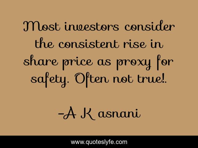 This page presents the quote "Most investors consider the consistent rise in share price as proxy for safety. Often not true!.". Author of this quote is A K asnani. This quote is about finance, money, share, retirement-planning, stocks, investment, wealth,.