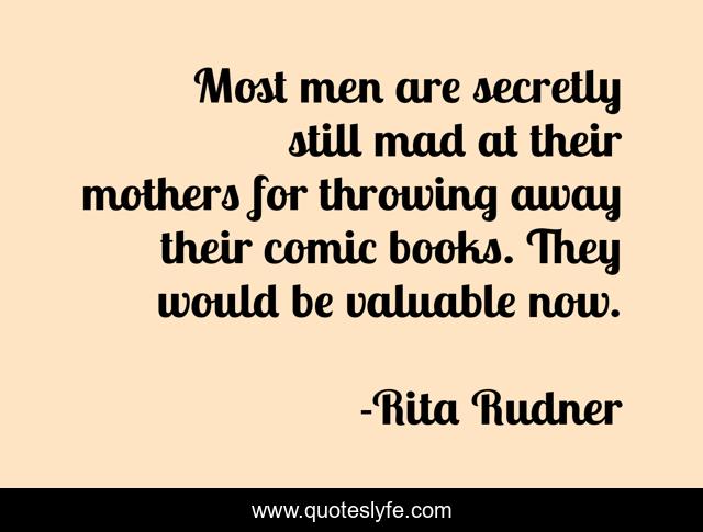 This page presents the quote "Most men are secretly still mad at their mothers for throwing away their comic books. They would be valuable now.". Author of this quote is Rita Rudner. This quote is about fathers, mothers,.