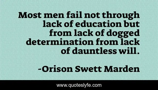 This page presents the quote "Most men fail not through lack of education but from lack of dogged determination from lack of dauntless will.". Author of this quote is Orison Swett Marden. This quote is about failures, mistakes,.