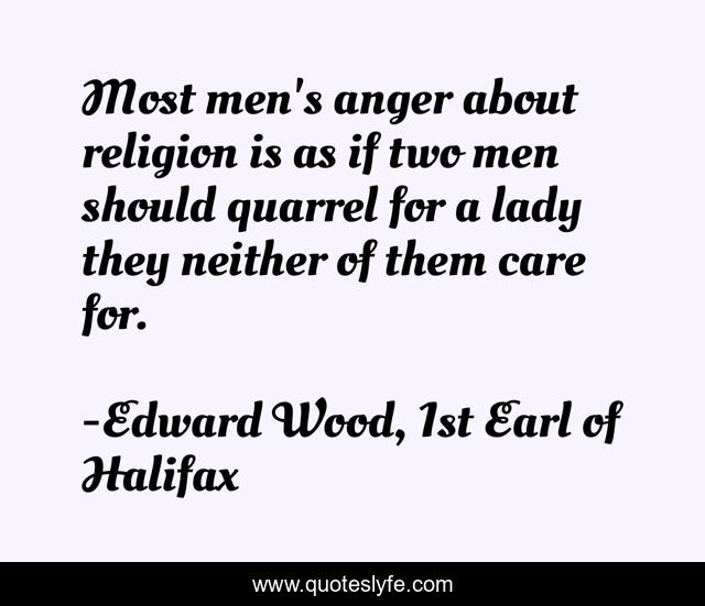 This page presents the quote "Most men's anger about religion is as if two men should quarrel for a lady they neither of them care for.". Author of this quote is Edward Wood, 1st Earl of Halifax. This quote is about religion, men, care,.