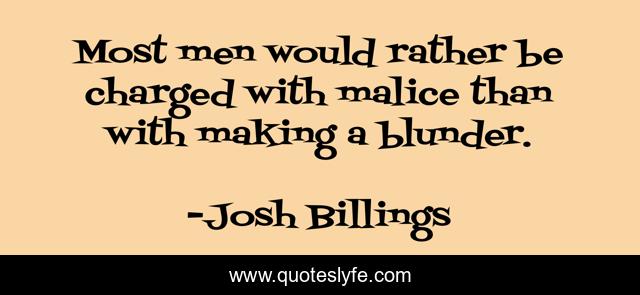 This page presents the quote "Most men would rather be charged with malice than with making a blunder.". Author of this quote is Josh Billings. This quote is about mistakes, blunders,.