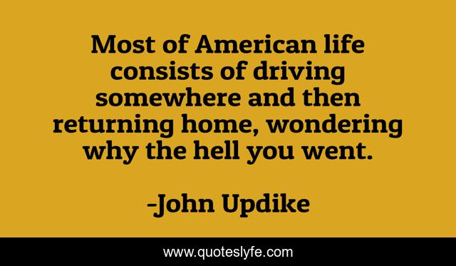 This page presents the quote "Most of American life consists of driving somewhere and then returning home, wondering why the hell you went.". Author of this quote is John Updike. This quote is about life, american, why,.